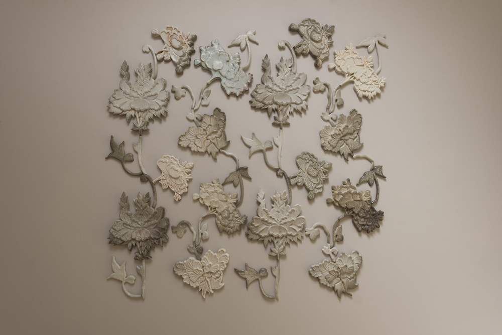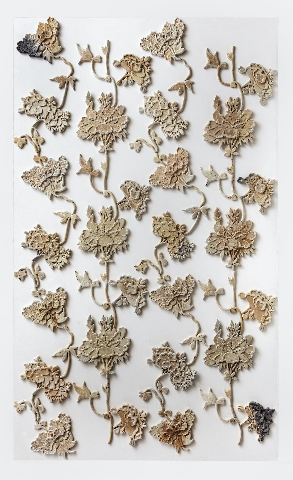 This time I will be presenting Ceramic Wallpaper: Peonies. I made this work when I was guest artist at Guldagergaard Woodfiring Symposium in Denmark and was made for my Ceramic House curatorial project, Interbeing, a collaborative exploration in ceramics and sound by artists from China, Hong Kong and the UK. Ceramic Wallpaper: Peonies consists of two wall mounted installations. The larger of the two measures 3m x 1.8m, is made of unglazed porcelain fired in a wood kiln for 6 days; all the colours and textures resulted from the atmosphere in the kiln, flames and ash. The other piece measures 1.5 x 1.4m, also unglazed porcelain fired in a wood kiln with the introduction of soda, which produced a palette of hues in grey with a shiny finish. The larger piece was selected for the XVI International Biennial of Ceramic Art of Aveiro in Portugal. The soda wood fired piece was part of Emptiness is Form, an exhibition of Chinese ceramics at The Ceramic House, part of Interbeing. Ceramic Wallpaper: Peonies also features in our book Perfection of Understanding, published as a finale of Interbeing, in the form of a photo-essay whereby the peonies take a virtual tour of China, digitally transposed on to photographs of significant walls of China submitted by artists involved in Interbeing.